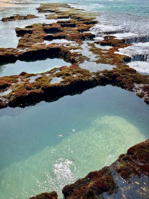 Die Becken in den Felsen sind durch Meereserosionen entstanden und füllen sich durch die Wellen mit Meerwasser. Einige Becken wurden von Menschen erweitert und geglättet um das Baden zu erleichtern. Innerhalb der Becken ist das Wasser meist sehr ruhig, allerdings brechen die Wellen natürlich immer rein. Sie sind ca. 1,5m tief und gerade bei Ebbe kann man sie sehr gut sehen. Außerdem findest du in den Becken oft auch kleine Fische, Krabben oder Seeigel - sei deshalb auch etwas vorsichtig. Der Strand ist insgesamt nur wenig besucht und daher sehr ruhig. Ich bin über die Felsformationen zum Strand gelaufen. Das kann auch etwas rutschig sein!